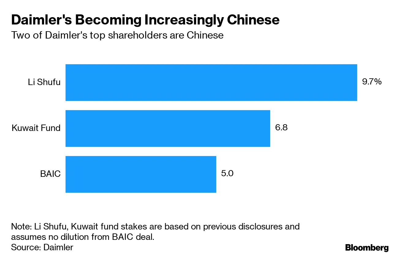 戴姆勒及其中国合作伙伴,北京汽车集团,正在 加深他们十年的联盟。国有的BAIC正在收购这家梅赛德斯-奔驰制造商5%的股份。与戴姆勒的主要股东——浙江吉利的亿万富翁李书福一起,这笔交易将使全球最大的豪华汽车制造商的中国持股比例接近15%。至少还有人 仍然对戴姆勒情有独钟,大卫·菲克林为彭博社观点写道。