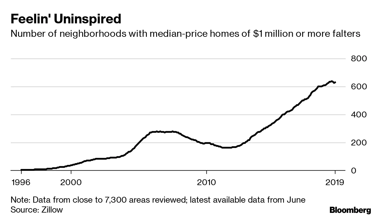 百万美元社区 正在受到冲击。根据彭博社对1996年至6月Zillow数据的分析,44个曾经超过基准价格的社区已跌至其以下。但 其他社区则有所上升,包括纽约斯塔滕岛的灯塔山,那里中位数价值在三月份突破了七位数。加利福尼亚州圣拉斐尔的马林伍德和佛罗里达州萨拉索塔的利多基也在上个月加入了百万美元俱乐部。