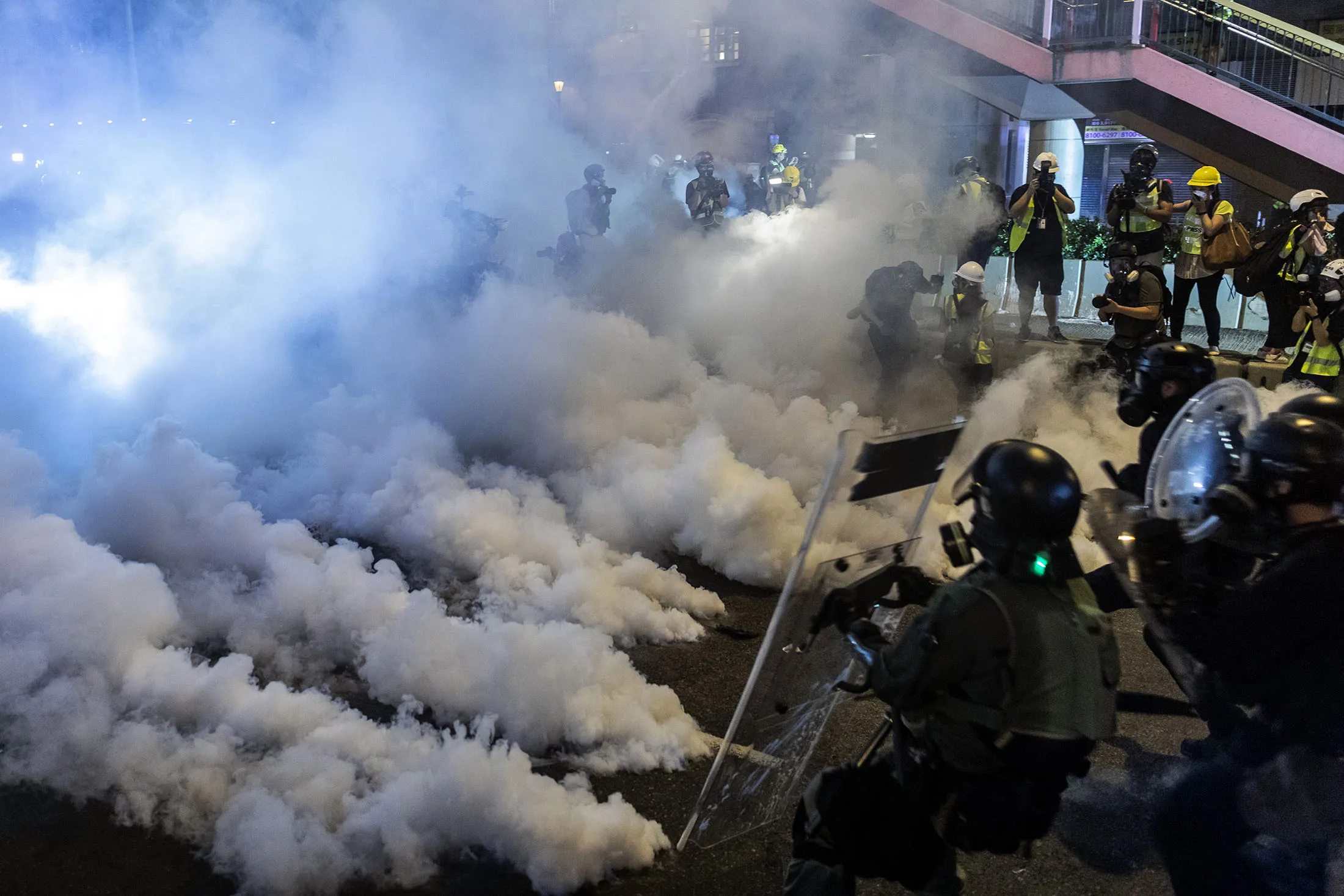 防暴警察在7月21日的抗议活动中走向一片催泪瓦斯云,试图驱散示威者。摄影师:Justin Chin/Bloomberg以下是我们对Kwok和另外两位香港居民的介绍:23岁的失业者K.T. Li和66岁的退休人员Andrew Au。尽管他们对抗议活动的看法不同,但他们在对香港长期未来的绝望感上是团结的。