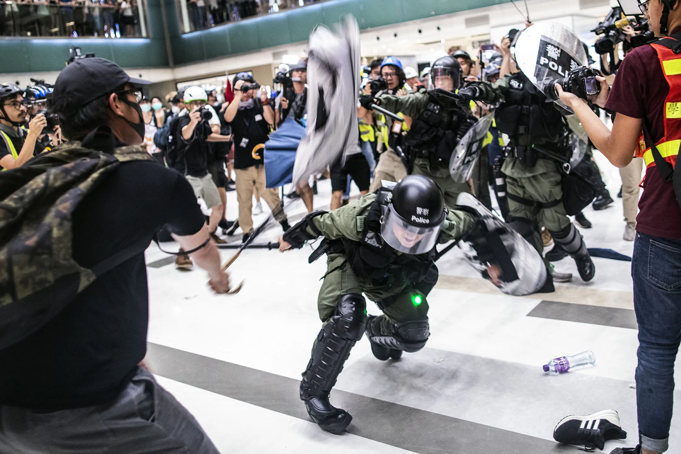 防暴警察与示威者在沙田的新城市广场购物中心发生冲突,7月14日。摄影师:贾斯廷·陈/彭博社香港目前运作为一种准民主制度,但许多人担心在未来几十年会失去自由。中国对维持当前体制——称为“一国两制”的法律承诺将在2047年到期。中国批评抗议活动,称这些活动威胁到香港经济的健康。最近几周,北京对升级的暴力行为发出了最严厉的警告,称抗议者正在测试其“底线”。
