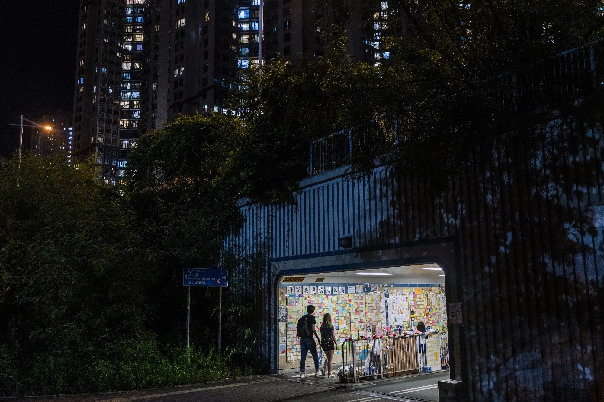 行人进入一个隧道,隧道上贴有在香港坑口区的列侬墙上的信息。摄影师:贾斯廷·陈/彭博社“我祖父那一代是土地拥有者,对共产党没有什么好感,”他说。“但现在正在改变。”