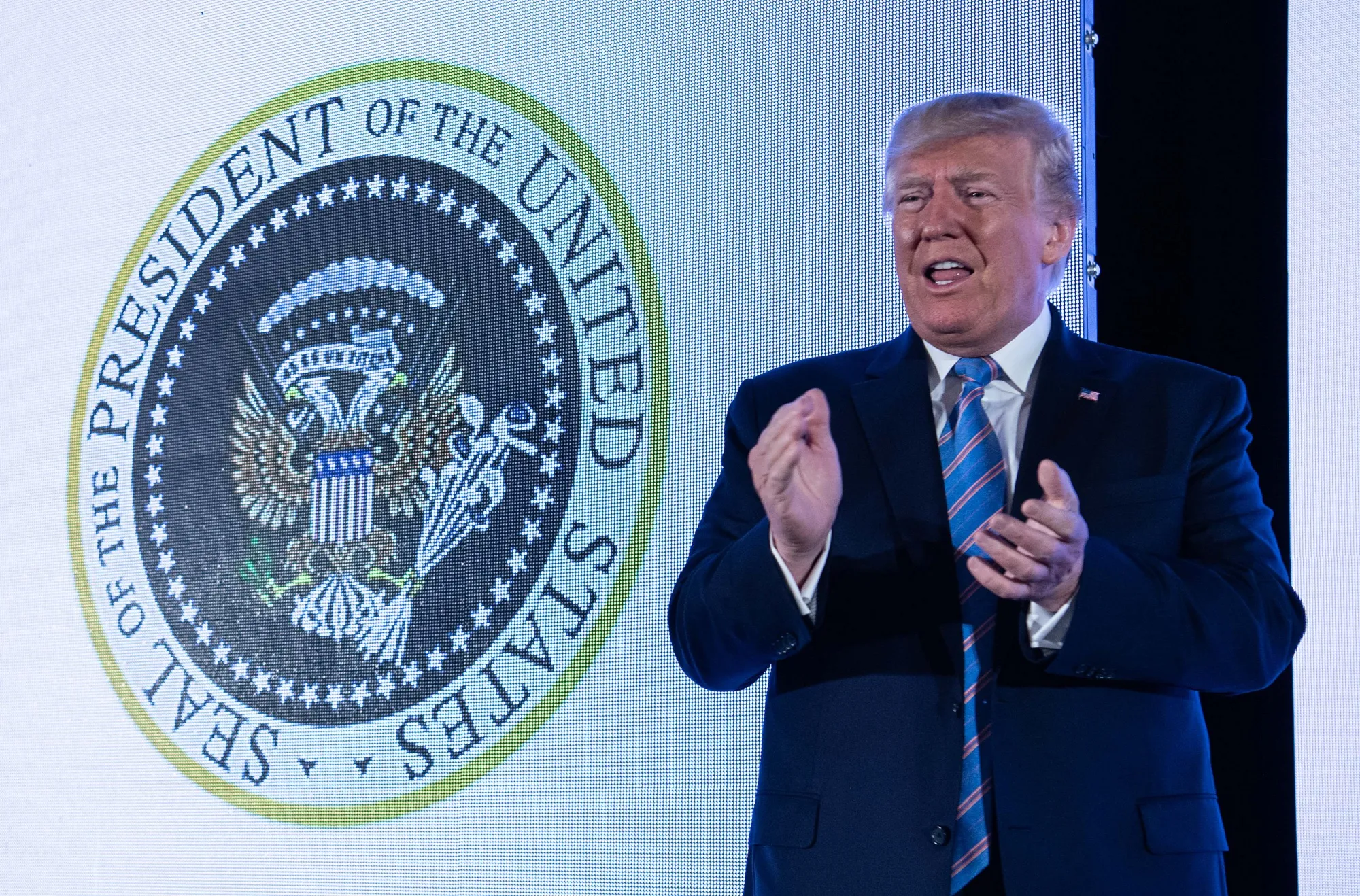 美国总统唐纳德·特朗普在2019年7月23日抵达华盛顿,参加Turning Point USA的青少年学生行动峰会时,站在一个秘密修改过的总统印章旁边。(照片由尼古拉斯·卡姆提供 / 法新社)(照片版权应注明尼古拉斯·卡姆/法新社/盖蒂图片社)摄影师:尼古拉斯·卡姆/法新社### 重要数字