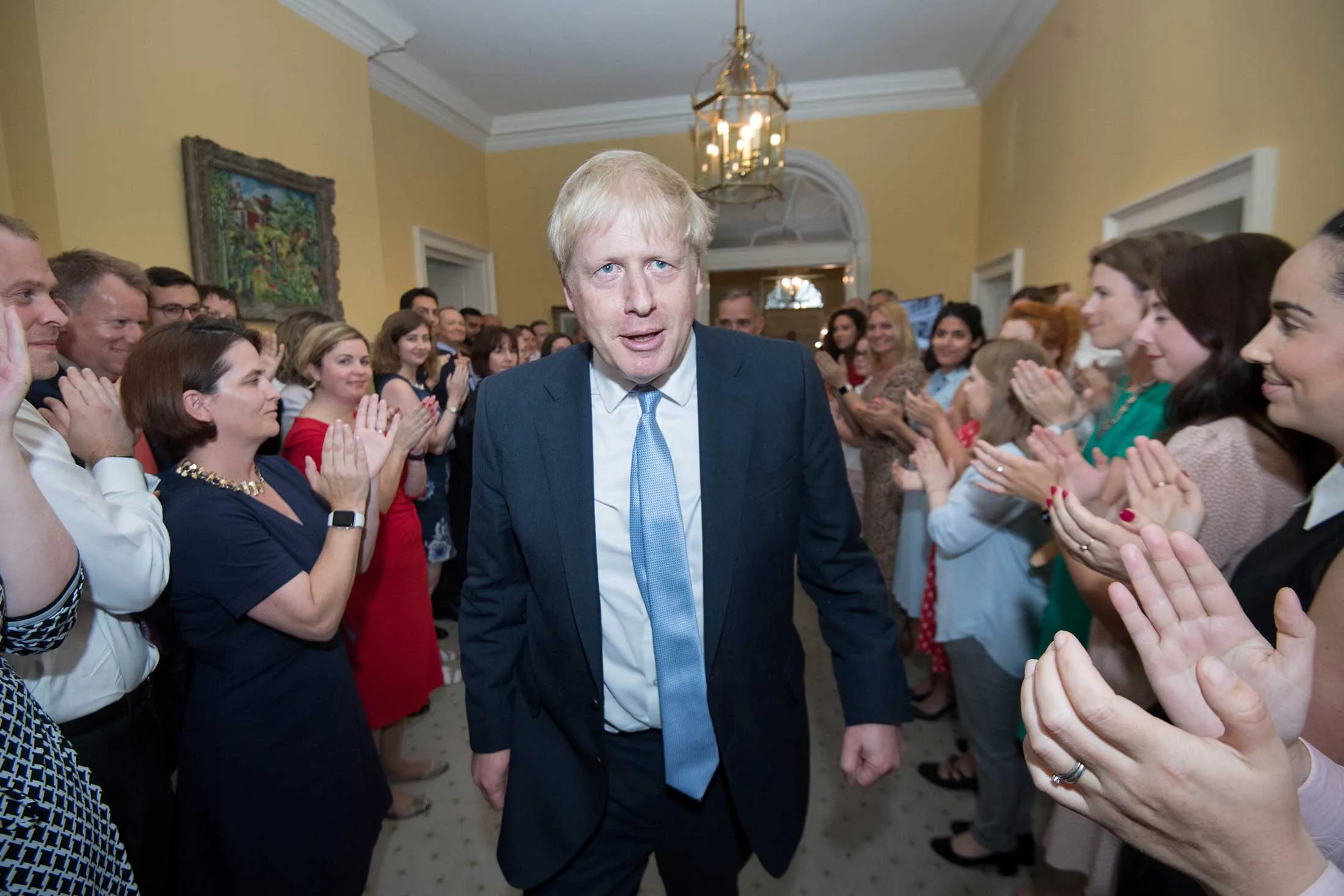 英国首相鲍里斯·约翰逊在伦敦唐宁街10号受到工作人员的欢迎,此前他于7月24日会见了伊丽莎白二世女王,并接受了她的邀请组建新政府。
