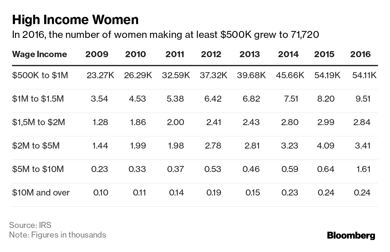 根据IRS数据,百万富翁女性的收入超过百万富翁男性。在2016年,收入至少为100万美元的女性平均收入为2,506,220美元,而男性为2,477,680美元。尽管男性高收入者远多于女性,但女性百万富翁俱乐部的成员数量从2009年的6,597人增加到2016年的17,609人。