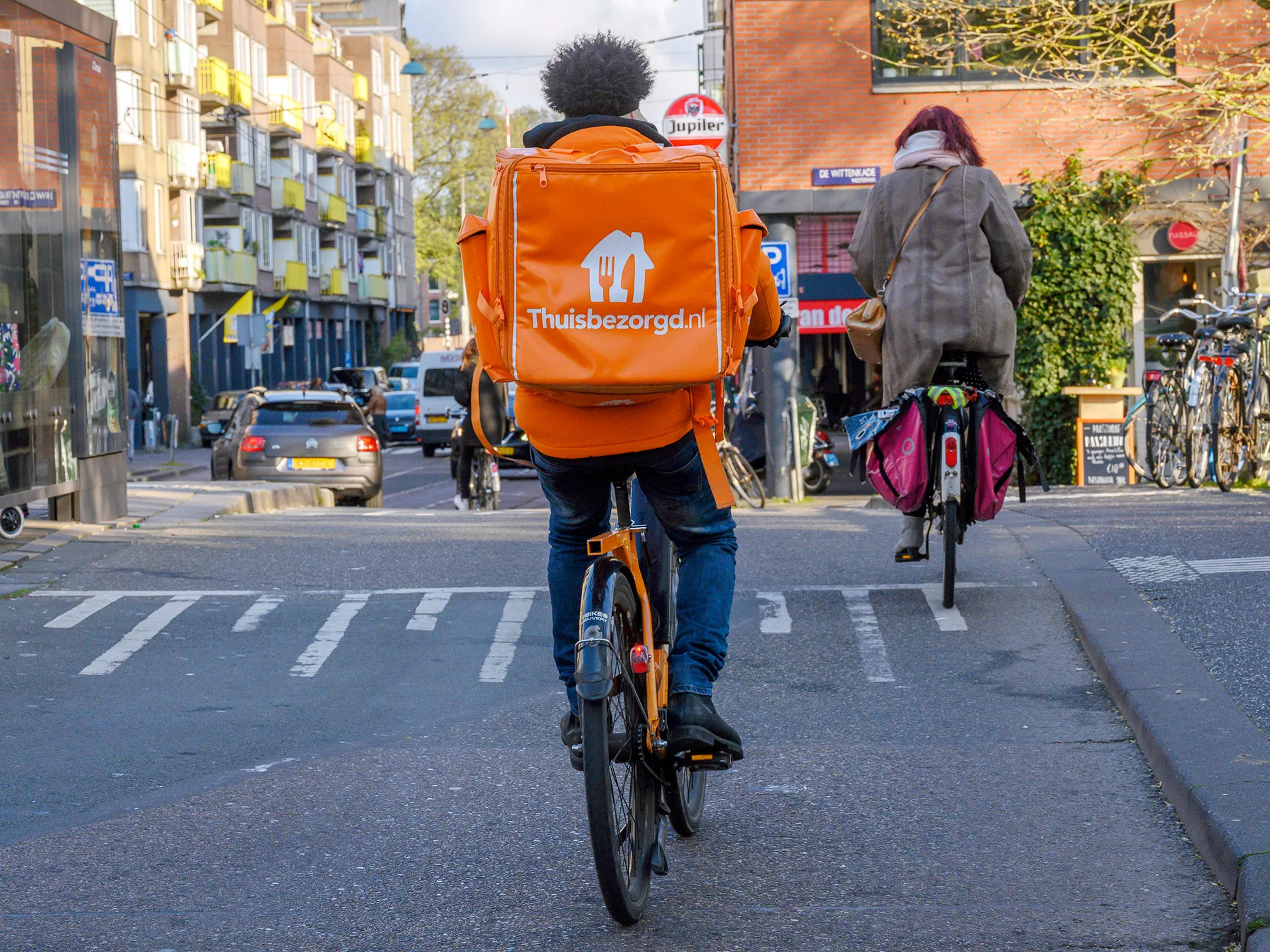 阿姆斯特丹,荷兰 - 4月13日:Takeaway.com 的骑手在2019年4月13日于荷兰阿姆斯特丹的Westerpark附近骑行。Takeaway.com由现任首席执行官Jitse Groen于2000年以荷兰名称Thuisbezorgd.nl创立,是一家专注于在线食品订购和家庭配送的荷兰互联网公司,作为附属餐厅与可以在线从菜单中订购食物的客户之间的中介在线门户,直接将食物送到他们手中。目前它在10个国家运营,其首席执行官表示在荷兰和比利时是市场领导者。(照片由Horacio Villalobos - Corbis/Corbis通过Getty Images提供)摄影师:Horacio Villalobos/Corbis新闻一名Takeaway.com骑手在阿姆斯特丹携带客户的订单。摄影师:Horacio Villalobos/Corbis新闻