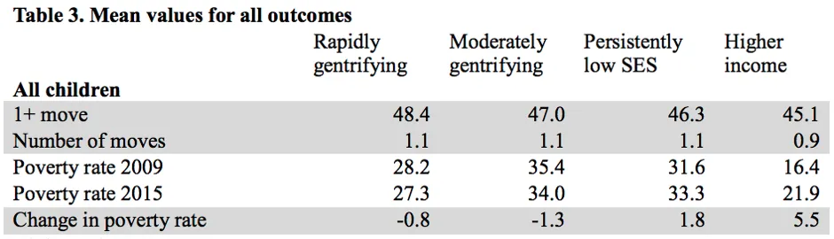 但这并不是研究所显示的。可以肯定的是,这些家庭过着极其流动的生活:低收入家庭的儿童在此期间很可能会搬家多次,无论他们的邻里、居住地或人口统计群体如何。但生活在经历了城市更新的邻里中的低收入儿童并不比生活在没有城市更新的持续低收入邻里中的儿童更容易被迫搬迁。事实上,即使周围的邻里的收入增加,这些儿童中的大多数仍然留在原地。