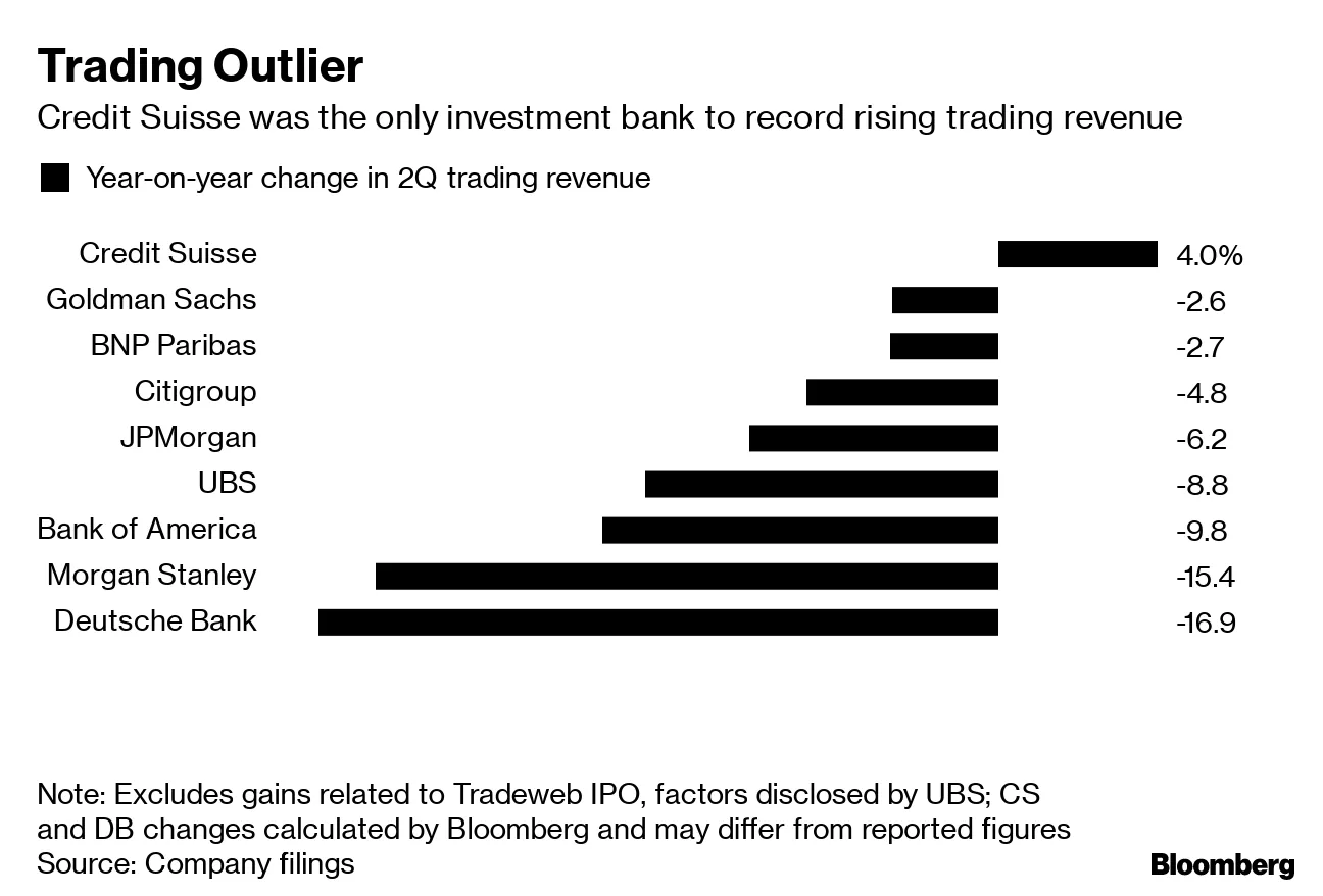 毕竟,欧洲银行还有一些希望。瑞士信贷、法国巴黎银行和意大利联合信贷都 摆脱了行业的阴霾,发布了 超出预期 的交易收入,表现优于大多数华尔街同行。在此过程中,他们超越了净收入预期,股价上涨。这是好消息。坏消息呢?不要指望反弹会持续,彭博社观点的埃莉萨·马丁努齐说。