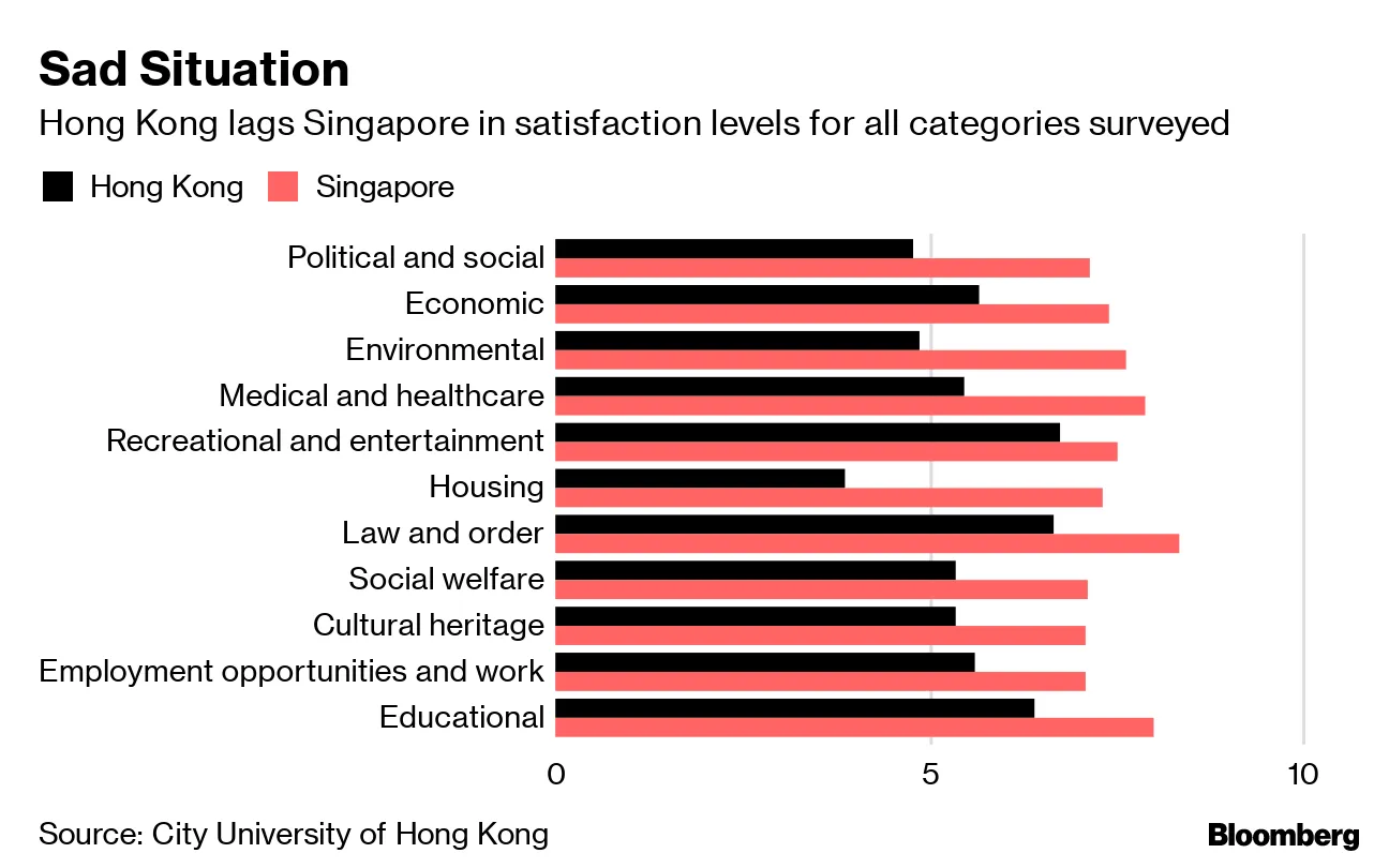 香港的年轻人没有新加坡的年轻人那么快乐,香港城市大学的一项调查显示。“幸福指数”研究是在香港示威活动开始之前进行的。香港居民的幸福感平均评分为6.80,而新加坡人的评分为7.48。该调查的首席研究员表示,如果现在进行这项研究,香港居民的幸福感水平会更低。
