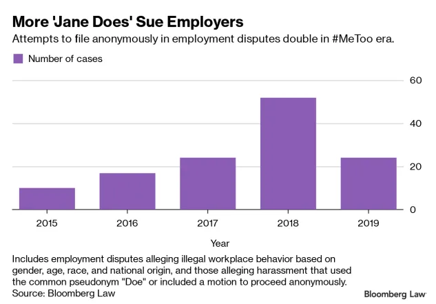 一项 彭博法律 的分析 显示 在 #MeToo 运动之后,匿名提交的歧视和骚扰诉讼数量翻了一番。今年的例子包括一名表示因性取向而遭到骚扰但不想公开其性取向的男性,以及一群担心因投诉工作场所兄弟会文化而遭遇“职业自杀”的女性。