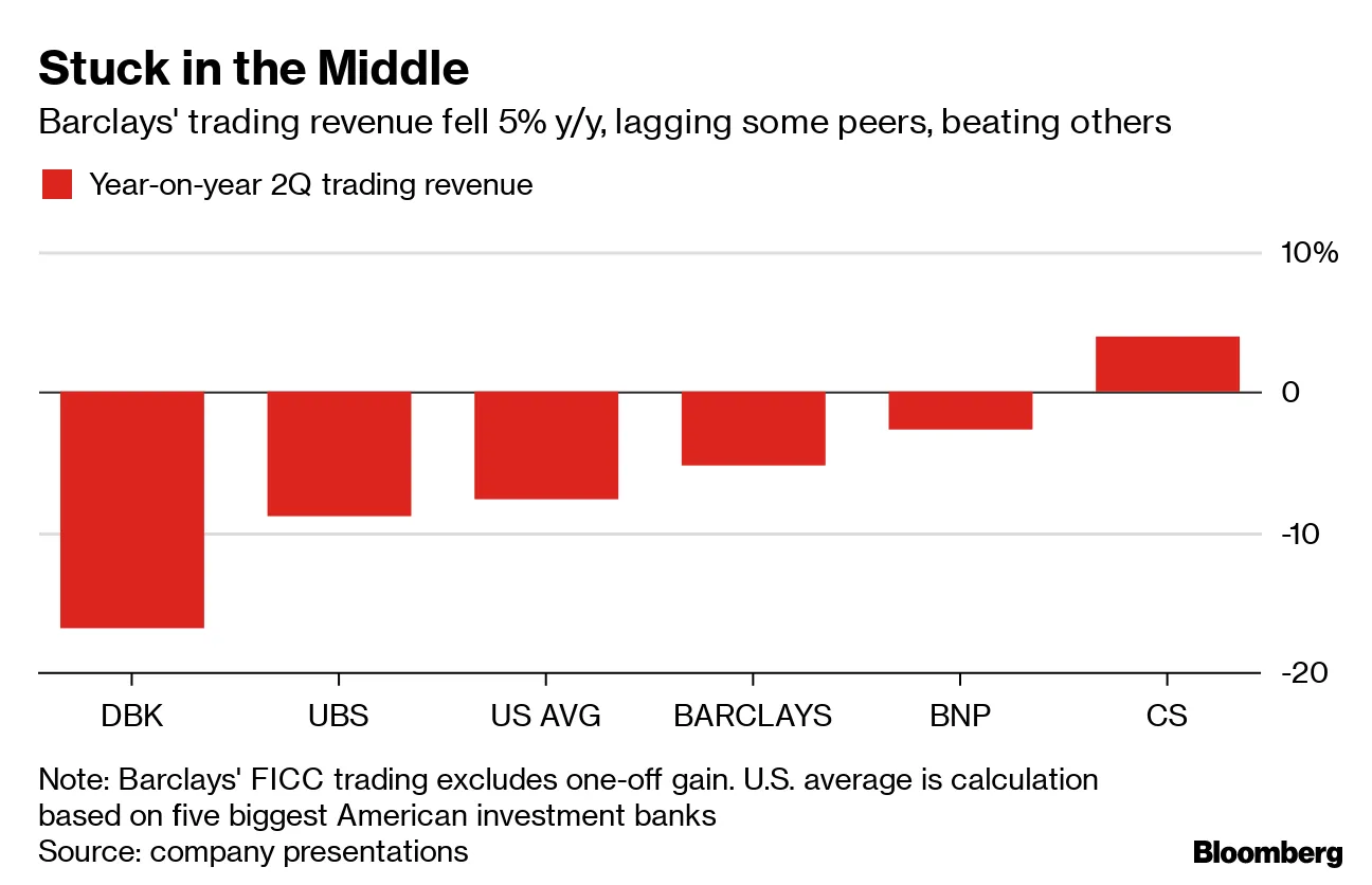 形势正在好转,对于欧洲最大的银行来说,这个财报季意外地积极。这次轮到了巴克莱,发布了一份 强劲的第二季度业绩,其投资银行业务占主导地位。首席执行官杰斯·斯塔利在接受CNBC采访时表示,他“非常有信心”公司能够实现全年盈利目标,股价上涨。如果他失败,经济损失和无协议脱欧的干扰可能会为他提供 一些便利的掩护,彭博社观点专栏的埃莉萨·马丁兹写道。