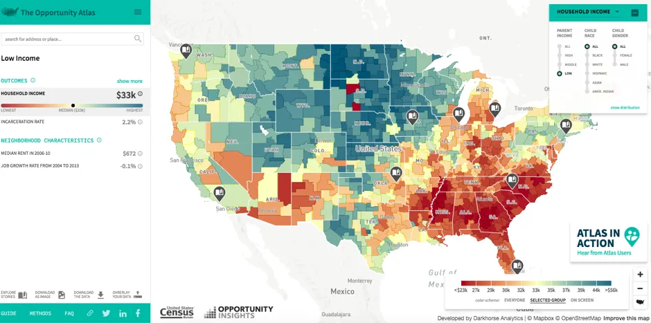 在2018年,国会通过了 住房选择券流动示范法案,该法案授权全国的公共住房机构进行住房流动试点。机会洞察组织对这些示范项目的成果有很好的预期:该组织的“机会地图”绘制了关于家庭收入、种族和社区特征的大量数据。