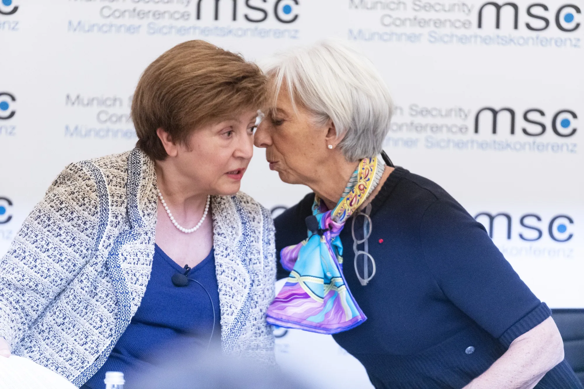 国际货币基金组织(IMF)总裁克里斯蒂娜·拉加德(右)在2019年2月15日星期五于德国慕尼黑举行的慕尼黑安全会议开幕日的一个小组讨论中发言,而世界银行集团首席执行官克里斯塔琳娜·乔治娃在旁聆听。网络安全将成为年度安全会议的主要主题之一,会议将于2月15日至2月18日举行。摄影师:彭博社/彭博社克里斯塔琳娜·乔治耶娃和克里斯蒂娜·拉加德在二月份的一个小组讨论中交谈。摄影师:彭博社。