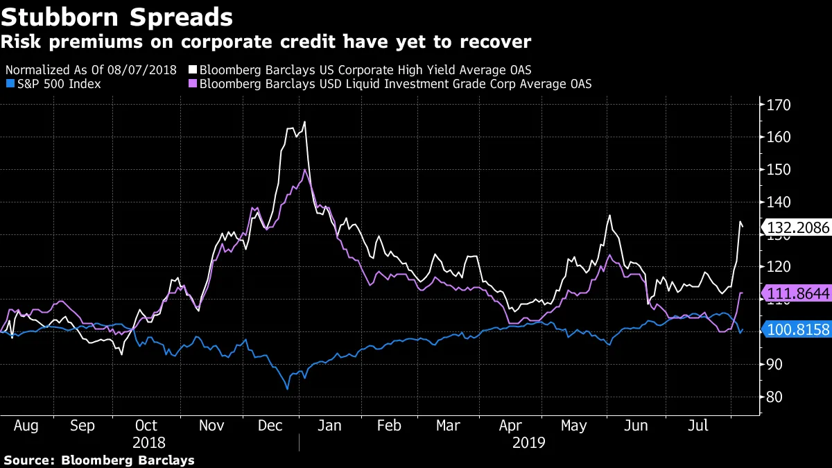 本周, 股票的抛售 成为了焦点,但看看信用市场发生了什么。周一,在中国允许人民币贬值后,美国垃圾债券的利差出现了八年来最大的一日变动——风险溢价扩大了40个基点,达到439个基点,超过美国国债。投资级债务的情况也是如此。