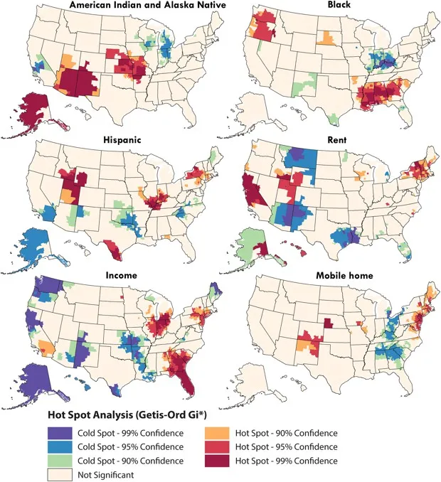 下一张地图显示了根据种族和住房等关键社会经济因素的管道贫困热点。黑人美国人在深南部以及华盛顿和俄勒冈州更可能经历高水平的管道贫困。西班牙裔在德克萨斯州的边境地区更可能出现这种情况,但在纽约州和犹他州也有。美洲印第安人和阿拉斯加土著家庭在阿拉斯加、亚利桑那州、新墨西哥州、内布拉斯加州、堪萨斯州和密苏里州更可能出现管道贫困。