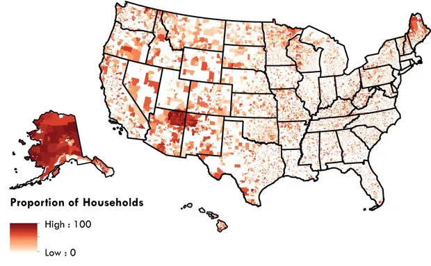 如上图所示,它在阿拉斯加、西南部、上中西部和东北部的部分地区高度集中,尤其是缅因州北部和新罕布什尔州,以及宾夕法尼亚州和西弗吉尼亚州的阿勒格尼和阿巴拉契亚地区。