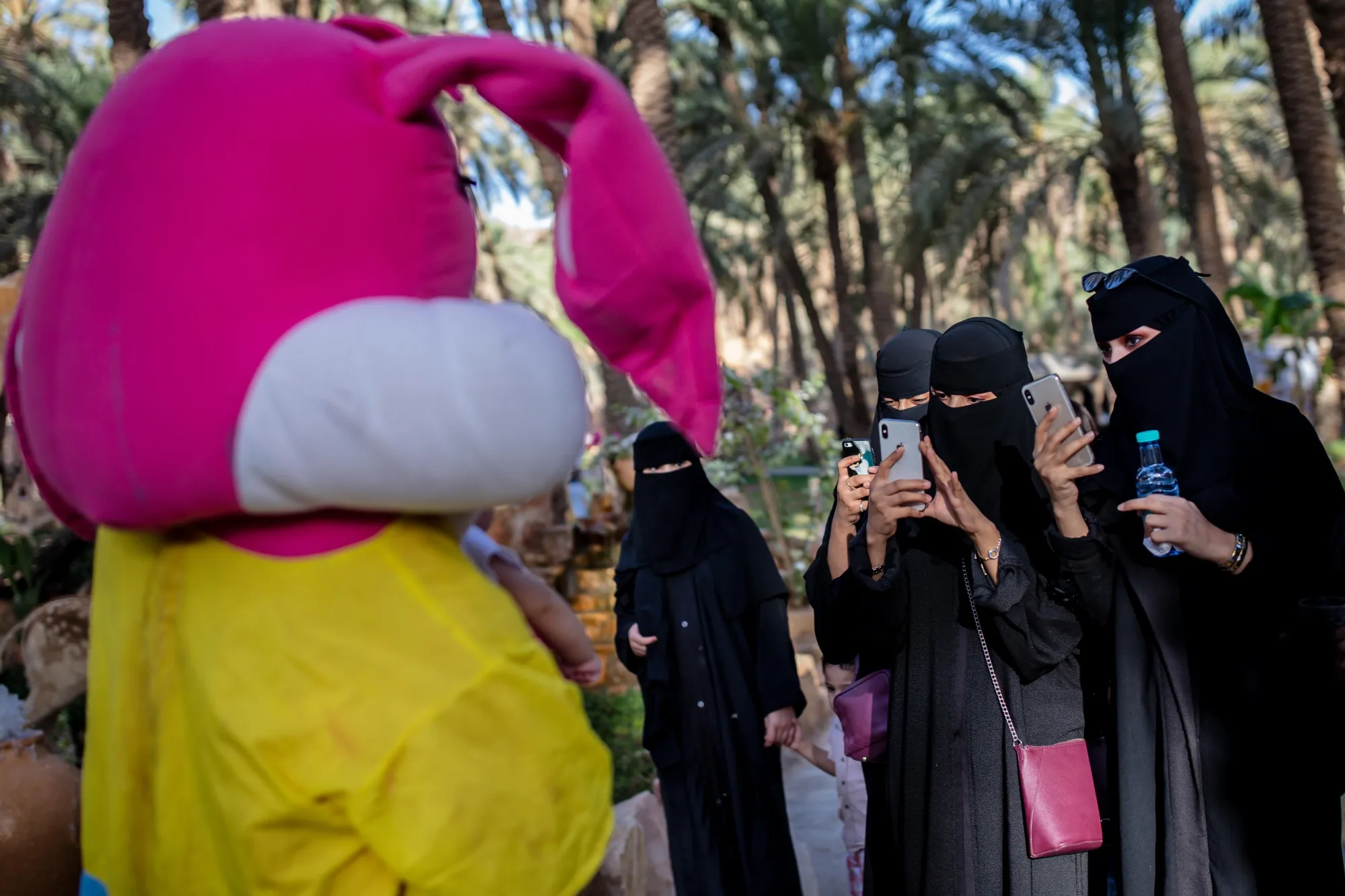沙特女性在布赖达的一个农场与穿着兔子服装的吉祥物拍照。改变正在缓慢地到来,这座保守的城市在利雅得和吉达接受改变多年后。摄影师:Tasneem Alsultan/Bloomberg“你称之为开放?我希望我们能变得正常,”布赖达一家餐厅的咖啡师塔米姆·阿尔-阿耶德说。