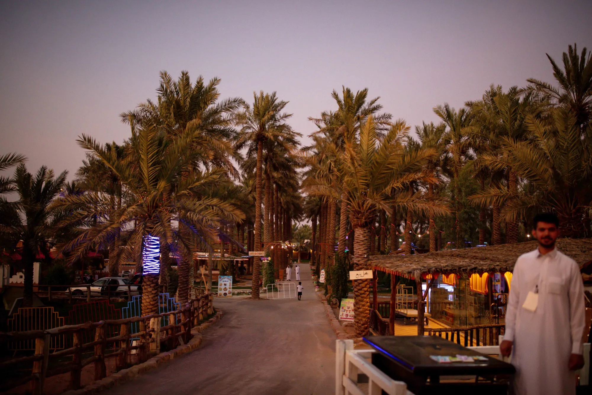 对更开放生活的渴望也在主要街道之外得到了满足。在一家通过向野餐者开放而发展出副业的枣农场,法蒂玛·阿卜杜勒-阿齐兹和朋友们坐在一条毯子上,享受着自制的甜点,彩灯下,夕阳西下。