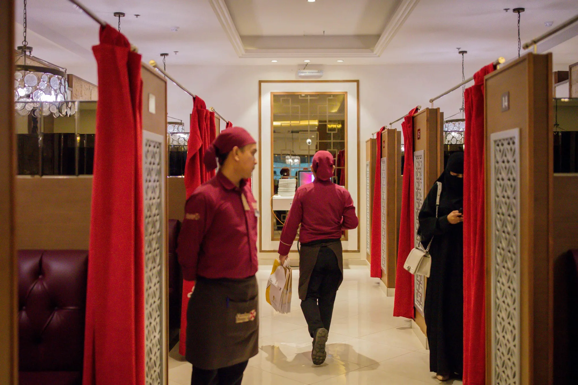 在布赖达外出就餐的家庭通常坐在包厢里,并通过帘子与其他顾客隔开。一些餐厅现在有开放区域,供那些不想在屏风后用餐的人使用。摄影师:Tasneem Alsultan/Bloomberg“你在这里看到的这些人,”他指着咖啡馆里的沙特人说,“大约占布赖达居民的三分之一,最多,想要开放,”阿尔-阿耶德说。