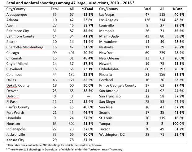 Nix 最近 更新了他的分析,使用2010年至2016年间47个最大城市的致命和非致命警察枪击事件的数据集,该数据集由 VICE 制作。该分析发现城市之间存在很大差异——在圣路易斯,16.8%的警察枪击事件是致命的;在凤凰城,51.9%是;而在坦帕,所有三起警察枪击事件都是致命的。