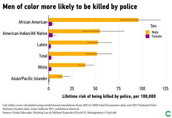 这 根据一项新研究,该研究由罗格斯大学刑事司法学院的弗兰克·爱德华兹、圣路易斯华盛顿大学社会学系的赫德维格·李和密歇根大学社会研究所的迈克尔·埃斯波西托进行。研究人员使用了2013年至2018年间由网站 致命遭遇 汇编的经过验证的警察杀人数据,该网站由内华达州记者D·布赖恩·伯哈特创建。在他们的模型下,他们发现大约每1000名黑人男孩和男性中就有1人会在一生中被警察杀害。对于白人男孩和男性,这一比例是每100,000人中39人。