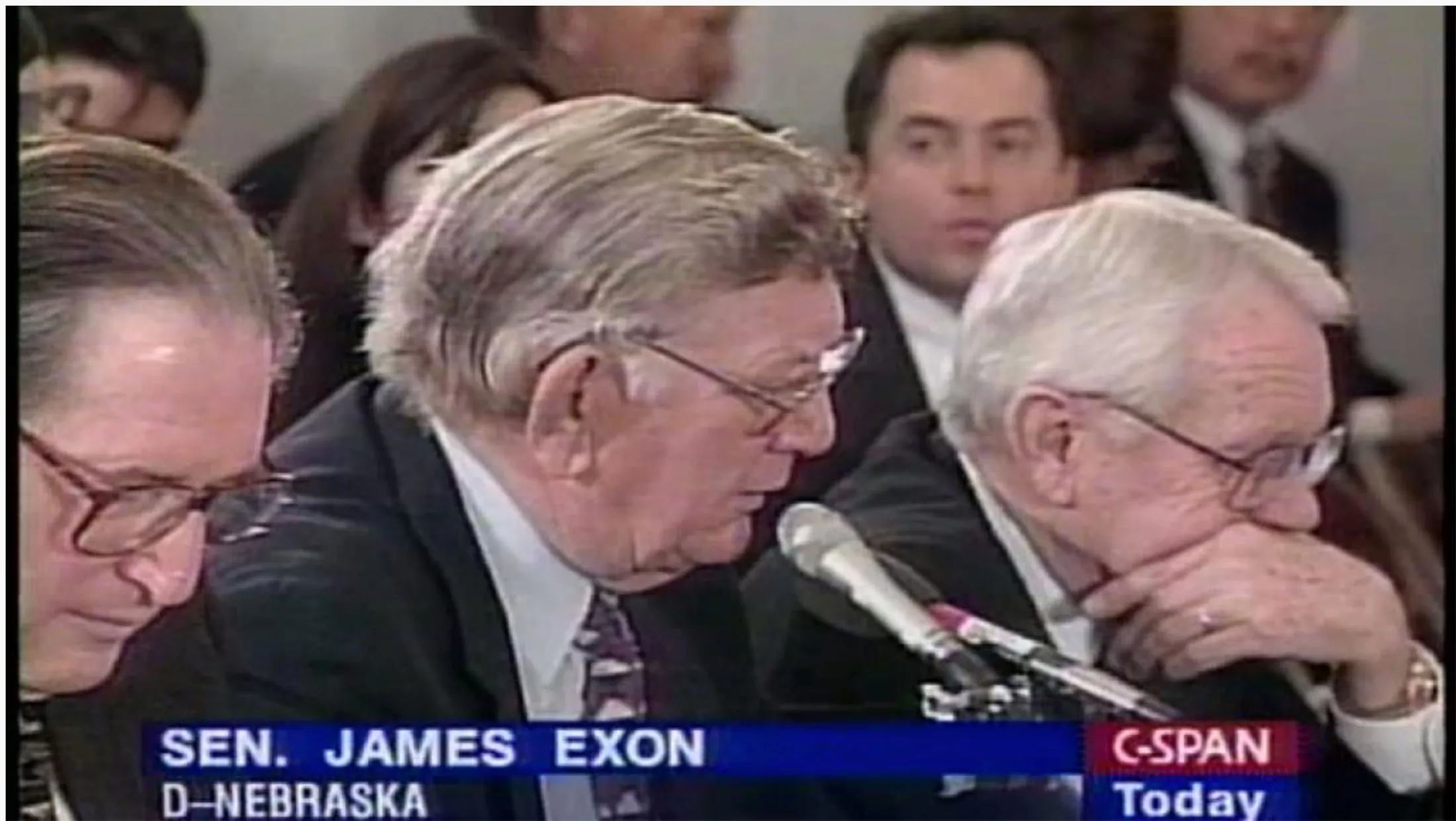 詹姆斯·埃克森在C-Span上作证。1995年6月9日,埃克森走上参议院的讲台,呼吁支持这项作为一项巨大的电信改革法案修正案的法案,该法案当时正在国会中进行审议。他挥舞着一个蓝色的三环活页夹,里面装有从网上下载的露骨照片的打印件,他说,任何有拨号上网连接的孩子都能找到这些照片。他打开活页夹,开始朗读:“色情癖好。裸体名人。色情束缚。……这里有一个好例子——色情卡通。”埃克森摇了摇头。