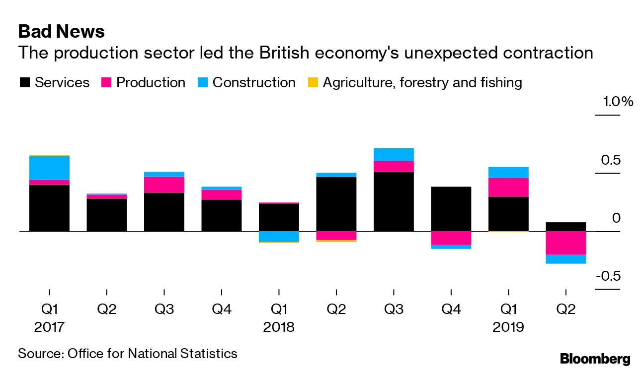 英国经济收缩,这是自2012年以来的第一次。第二季度GDP意外下降0.2%,使鲍里斯·约翰逊政府面临更大的压力,因为它寻求尽快退出欧盟。如果再有一个糟糕的季度,英国就有可能陷入技术性衰退。