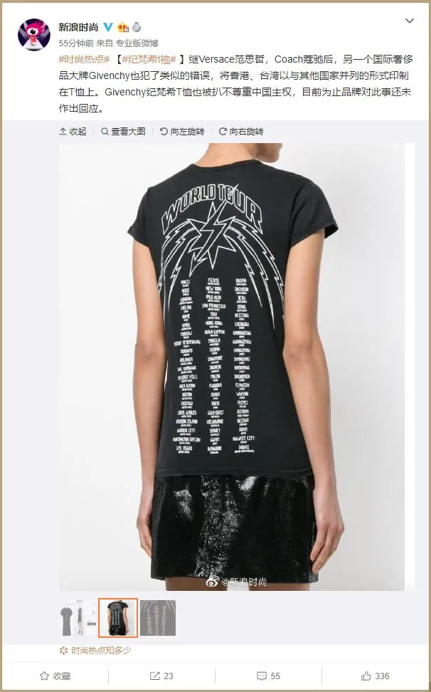 奢侈品牌Coach和Givenchy跟随Versace的步伐,在他们的T恤上使用地理参考,触犯了政治敏感性。Coach在社交媒体上引发了抵制的呼声,中国超级模特刘雯表示她将终止与该品牌的关系,因其“严重伤害了中国人民的感情。”这发生在中国女演员杨幂表示她将在Versace的争议在线爆发后结束与该品牌的合作,因为其一款T恤设计被指违反了“一个中国”政策。