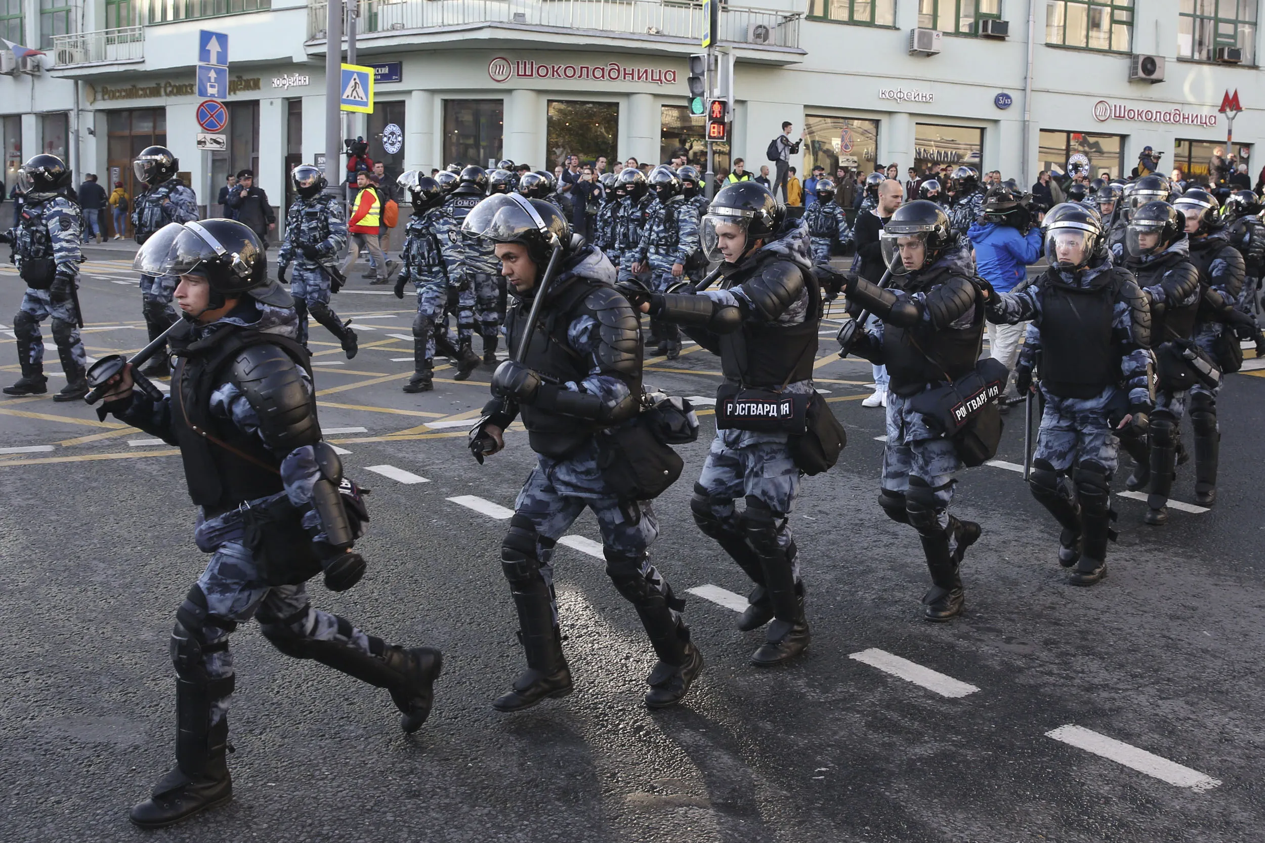 俄罗斯特警于8月10日在莫斯科的斯塔拉亚广场附近集结。