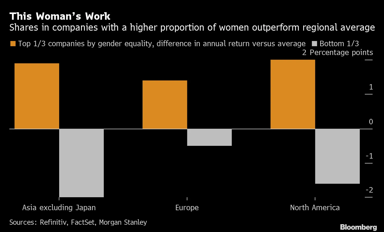 雇佣更多女性的公司 有 更好的股市回报,根据摩根士丹利的研究,该研究考察了全球近2000家公司。这个趋势在不同国家之间保持一致,尽管在某些地方更为明显。