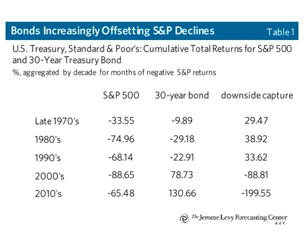 他的分析显示,长期债券正在越来越多地抵消对标普500造成的损害。