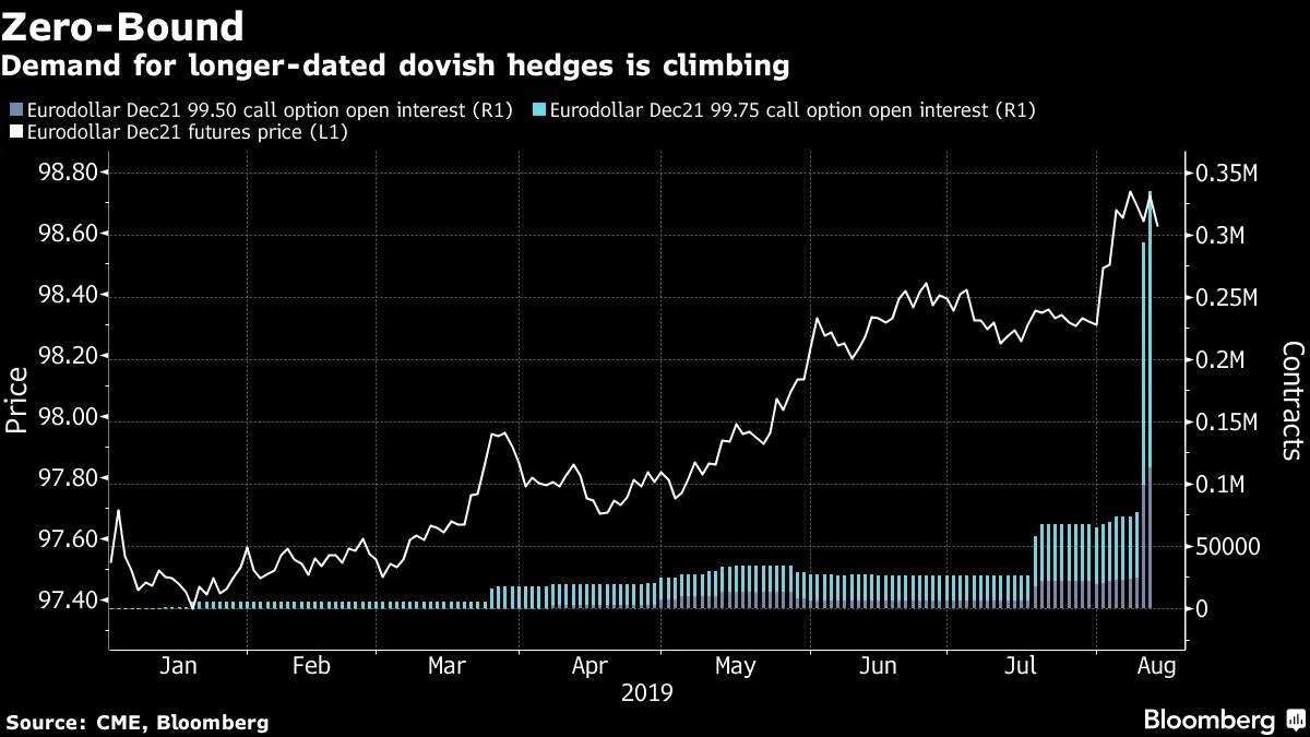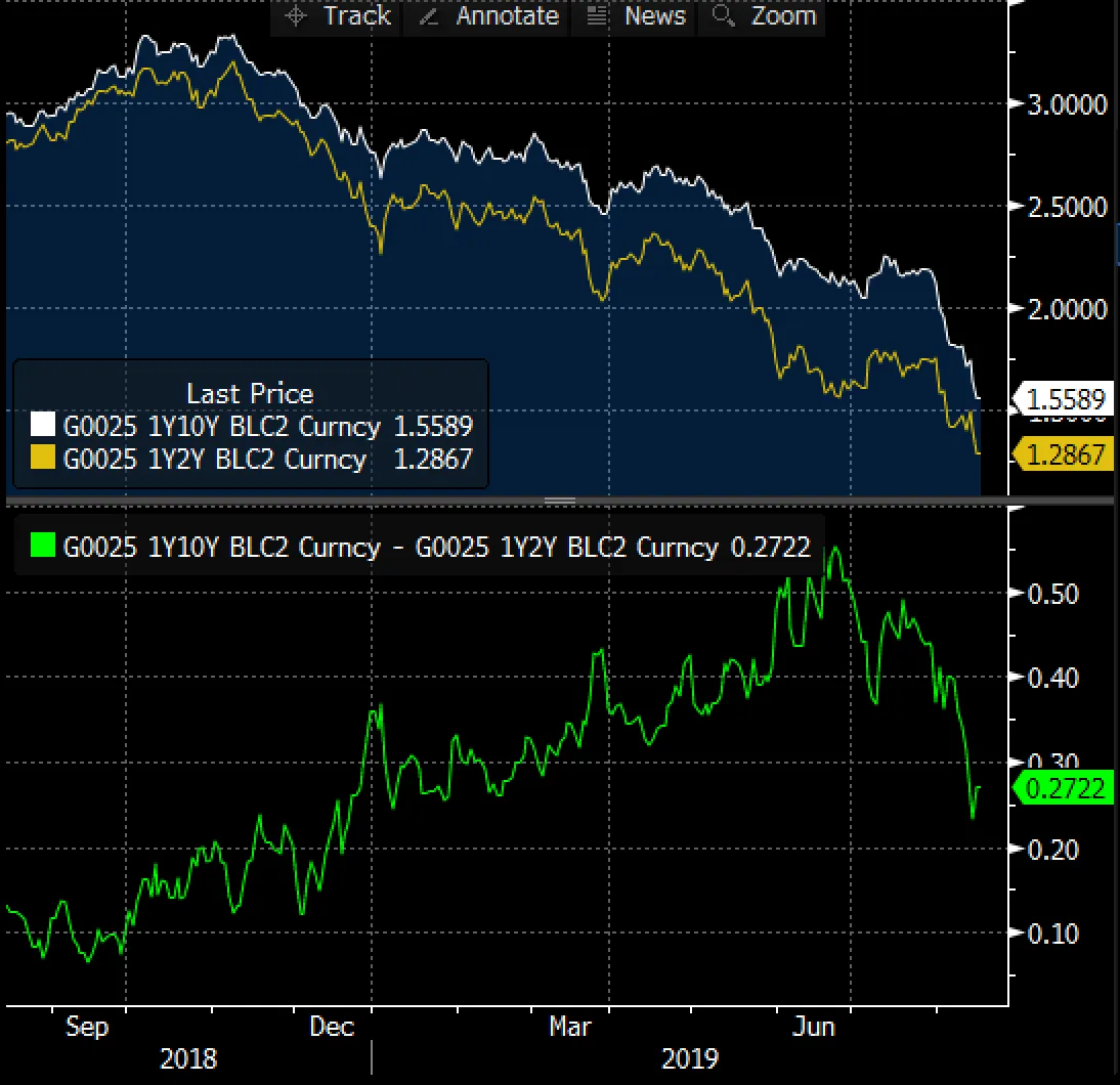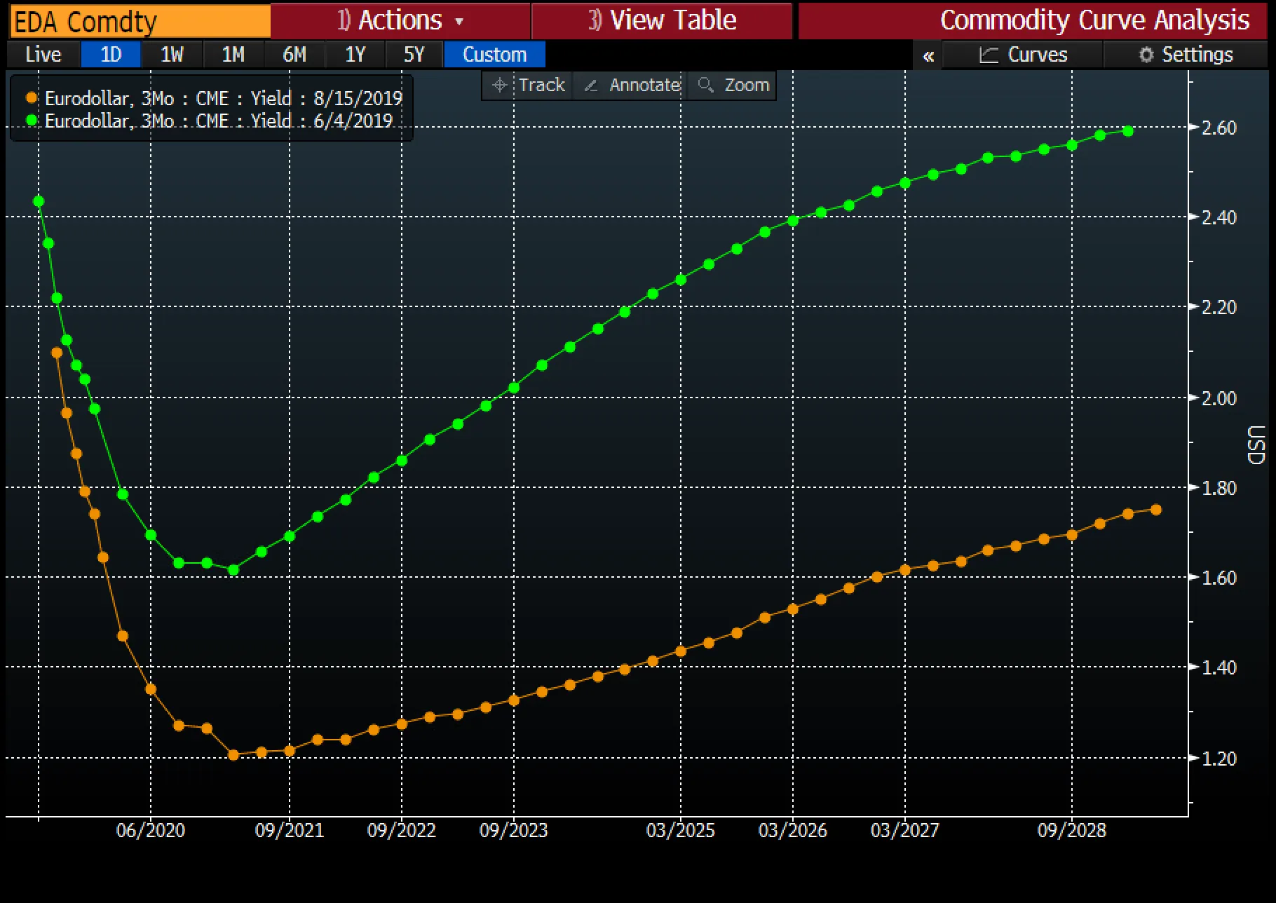 在美联储主席杰罗姆·鲍威尔在6月初的“适当行动”之后,欧元美元期货曲线指向美联储的宽松周期,并预计在预测范围内恢复到当前中性利率的水平。但现在情况不再如此:市场隐含的基本情况是更深的宽松周期,利率将保持较低水平更长时间。与此同时,远期曲线所隐含的扭曲加 steepening 的程度已经崩溃。