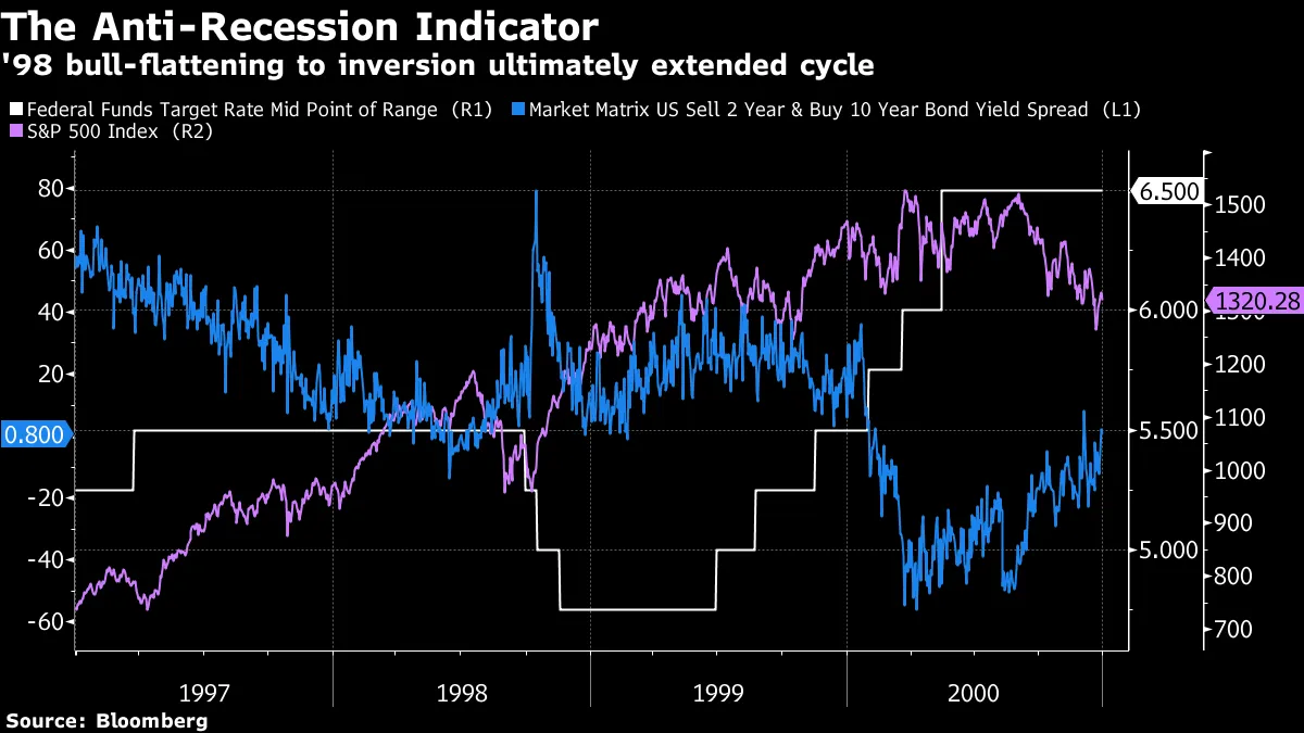 牛市扁平化到倒挂,长期利率下降速度快于短期利率,最后一次发生在1998年。亚洲货币危机与长期资本管理公司的崩溃的交汇引发了美联储的激进宽松。金融条件的收紧被逆转,全球混乱直到中央银行恢复紧缩周期并且互联网泡沫最终破裂之前并没有蔓延到国内。