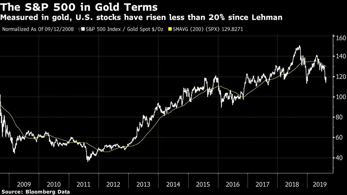 从黄金的角度来看,股票直到2011年美国债务上限危机时才触底。一旦明确低收益率没有引发更快的通货膨胀,并且美国不会违约,股票享受了一次大幅反弹。但目前在这一指标上,它们的水平与2015年没有更高。自四年前中国贬值前夕以来,这方面没有净增长。与债券图表一样,股票似乎正处于转折点。但如果不是,那么我们可能正处于一个临界点,就像2011年一样,当我们看到投资者接受债券市场对经济的担忧时,股票出现大幅长期下跌。