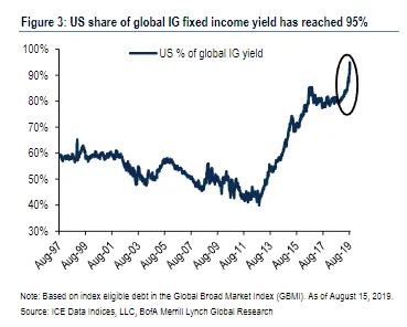 什么将决定我们走向哪个方向?在短期内,我怀疑美元可能是平衡机制。正如美国银行美林的信用策略师所展示的这张非凡图表,全球大约95%的所有具有正收益的投资级公司债务都在美国。因此,欧洲固定收益管理者在试图产生回报或确保能够匹配负债时,将面临购买美国债券的压力——这将对美元施加上行压力: