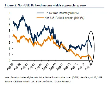 换句话说,当前美国以外的平均投资级公司债券的收益率为负。这使得美国的避风港显得更加吸引人,因为那里超过2%的收益率仍然是常态:
