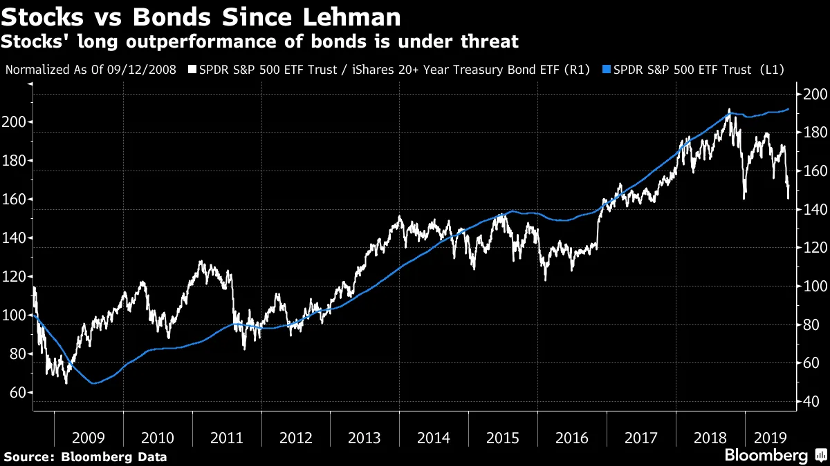 对于那些落后于进度或可能度假的人来说,最新的发展是德国和美国都在考虑在历史低收益率面前发行更多债务。作为回应,周一股价上涨,债券价格下跌。这表明市场状况比许多人想象的要微妙得多。这是自雷曼兄弟破产改变全球金融体系以来,股票与长期美国国债(由最受欢迎的交易所交易基金代表)表现的比较:
