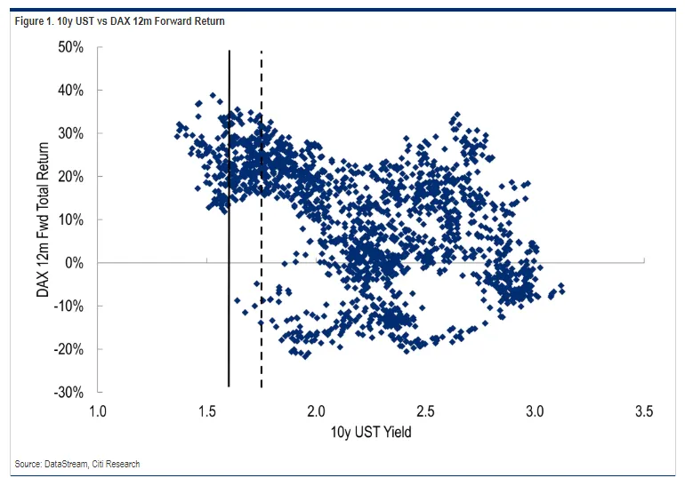 我们面前的选择看起来是二元的。花旗集团资深欧洲股票策略师乔纳森·斯图布斯简单地总结道。要么你应该买入股票,因为市场将迫使当局采取有利于股票的刺激措施,要么这次情况不同。而且影响是全球性的。正如他在这里所展示的,每当国债收益率降到如此低时,德国DAX指数随后的年度回报往往非常强劲: