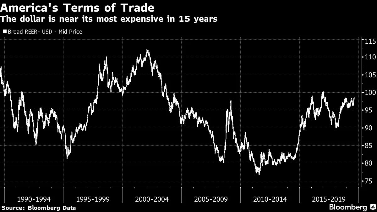 与此同时,特朗普政府希望美元贬值以帮助美国的竞争力。尽管美联储的翻转,但这并不是它所得到的。可能会夸大这一点,但美元正接近可能突破的水平,使其在过去15年中变得不那么具有竞争力。这是花旗集团针对广泛货币在30年内的实际有效汇率(考虑到不同的通货膨胀率)。在这一竞争力的衡量标准上,美元现在处于1990年代时并不显著的水平,但使美国出口商在过去十多年中大部分时间里变得不那么具有竞争力:
