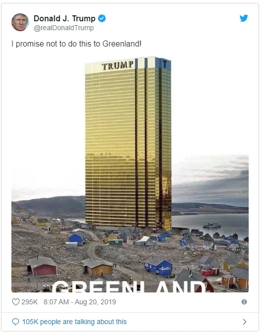 特朗普取消了对丹麦的行程 ,因为首相梅特·弗雷德里克森告诉美国总统,该冰封领土 不出售。“首相如此直接地表态,为美国和丹麦节省了大量费用和精力,”他在推特上写道。特朗普原定于9月2日应玛格丽特二世女王的邀请对丹麦进行国事访问。