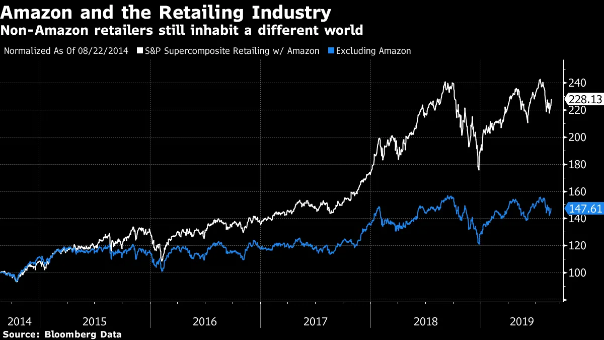 在这张图表中,白线是美国零售商的标准普尔1500指数,这是一个广泛的上市零售集团指数。蓝线是排除亚马逊后的同一指数。两者的基准都是从五年前开始: