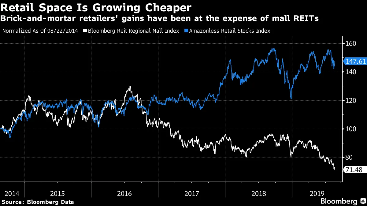 但股市正在关注零售商利润的健康状况,这与消费者的健康状况或实体零售行业的规模并不相同。为了更好地了解这一点,我们可以查看彭博社关于房地产投资信托基金在区域购物中心投资的指数,如下方的白色部分所示。曾几何时,购物中心REIT的表现大致与非亚马逊零售股票保持一致。但在过去三年中,实体零售商在很大程度上通过放弃实体店来巩固其股价。幸存的零售集团可能更加精简和强劲,但整个零售行业遭受的打击预计将产生持久的经济影响:
