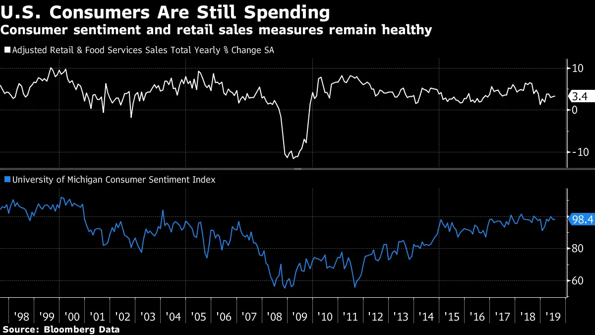 与此同时,关于零售行业健康状况的更广泛经济指标表明,许多人可能会预期的情况:美国消费者并没有受到严重打击,但健康状况可能有所恶化。这张图表显示了零售销售增长和密歇根大学消费者信心调查的数据,追溯到过去20年: