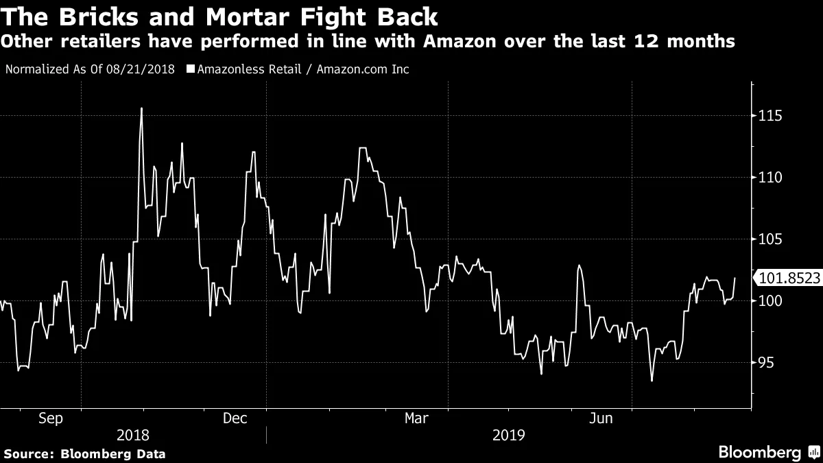 这也是亚马逊——就像其他所谓的FAANG股票一样——终于降温的一年。这张图表显示了排除亚马逊的零售行业在过去12个月中相对于亚马逊的表现。它的基准为100,最后为101,因此在这一年中,两者之间的差距仅为1%,基本上是平局。