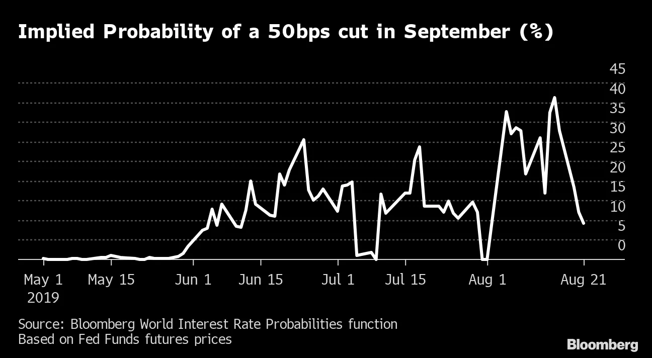 鲍威尔成功地将50个基点的降息预期削减至零;然后特朗普在一天后设法将其推高至超过三分之一。从那时起,大幅降息的概率与贸易头条和全球市场的发展恐怖秀保持一致。
