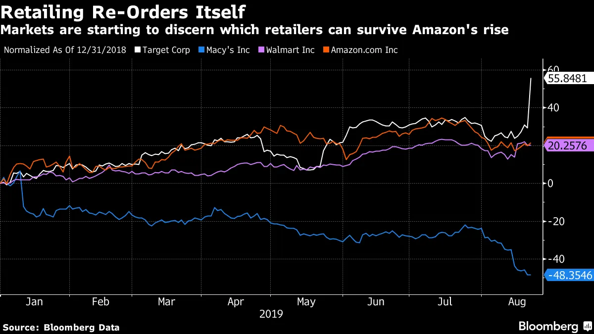 显然,亚马逊似乎居住在一个不同的星球上。但请注意,尽管排除亚马逊后,其他行业并没有完全消失,尽管看起来投资的吸引力远不如以前。今年也出现了一个迷人的过程,明确谁有应对亚马逊到来的良好策略,谁没有。正如下图所示,塔吉特(Target)今年表现出色,其最新的业绩更是锦上添花。沃尔玛(Walmart)与亚马逊保持同步,两者都度过了一个不错的年份。梅西(Macy’s)股价的灾难性下跌表明零售末日确实来临了。
