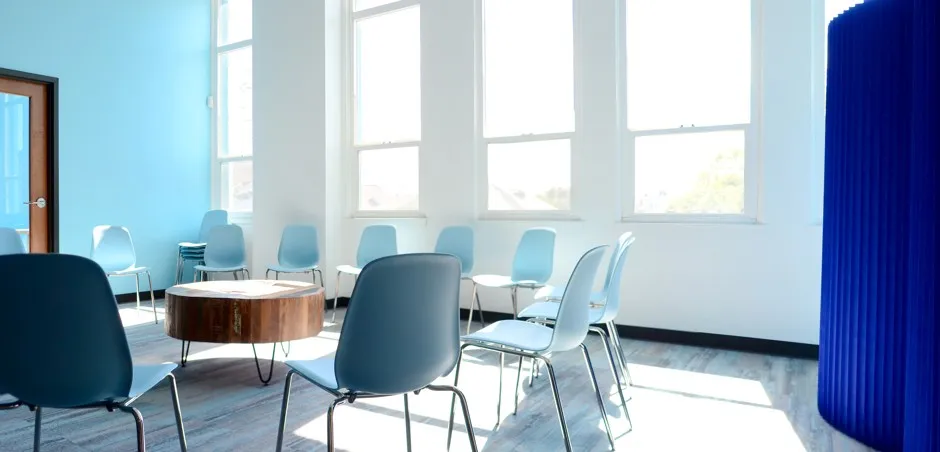 二楼非营利组织办公室的效果图。设计正义 + 设计空间Van Buren将恢复性司法原则融入了Restore Oakland的设计。一个用于冲突解决和行动计划的房间有两个入口,以及两个相邻的空间,供人们冷静下来并私下交谈。它是淡蓝色的,这种颜色被选为平静和舒缓。一个墙面是黑板;在我访问的那天,组织者们画出了代表社区治愈涟漪效应的同心圆。“改变叙事,”有人用粉色大写字母写道;“促进成长,”另一张便条上写着,下面开着一朵花。