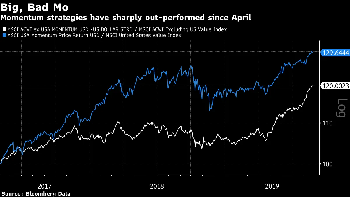 大坏摩这个月表现出色。动量因素——赢家股票继续获胜而输家股票继续失利的倾向——是市场上最有文献记录的因素之一。源于深层的人性,它往往有效。在过去十年中,紧跟赢家的尾巴所带来的结果远远优于购买便宜股票(称为价值因素)的竞争策略。但自五月以来,这一长期趋势已经进入超速发展阶段: