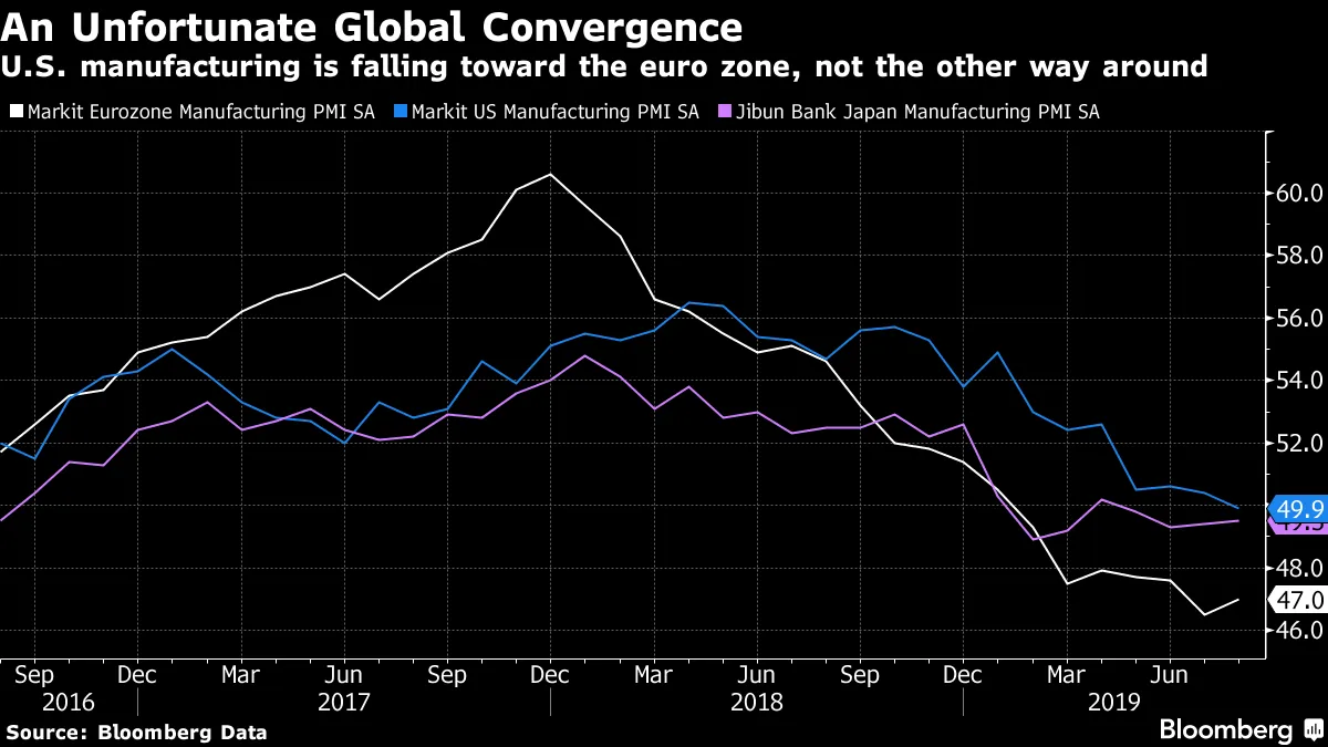 但是有一种观点认为,即使在负收益率下,债券市场也是合理的。我们从最新的全球制造业采购经理人指数快报中获得了一些很好的支持证据。这些早期指标显示最终数字将会落在哪里——所有指标都设定为50,标志着扩张与衰退之间的边界——表明美国正向发达世界的其他地区趋近,并且所有主要制造业部门现在都低于50水平: