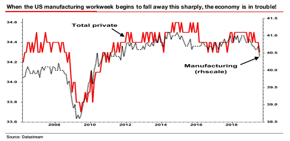 合理地说,这意味着国债收益率应该跟随全球增长,而不是特定的美国增长。为了加强他的论点,阿尔伯特建议收益率应该保持低位,因为即使一些看似强劲的经济数据实际上也开始闪烁警告信号。最新的美国非农就业数据带来了安慰,但他关注的是工作周的长度。当公司看到需要削减时,他们通常会首先尝试减少工作小时,然后再采取更痛苦的措施。这一逻辑意味着我们应该将最近工作小时的下降视为未来麻烦的信号:
