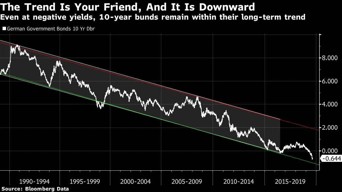 他对泡沫指控的最后一个辩护来自技术分析。自从保罗·沃尔克在1980年代初期战胜通货膨胀以来,10年期国债收益率一直呈稳步下行趋势。去年这一趋势似乎中断,但收益率现在又回到了其交易区间内。与此同时,德国国债的模式同样强劲——即使当前的负收益率也使市场舒适地处于其长期交易区间内。这里有一张我在彭博社上尝试复制的图表: